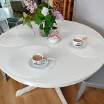 Neben den Annehmlichkeiten für Selbstversorger, darunter Küche, bietet das Apartment seinen Gästen einen Essbereich im Freien.